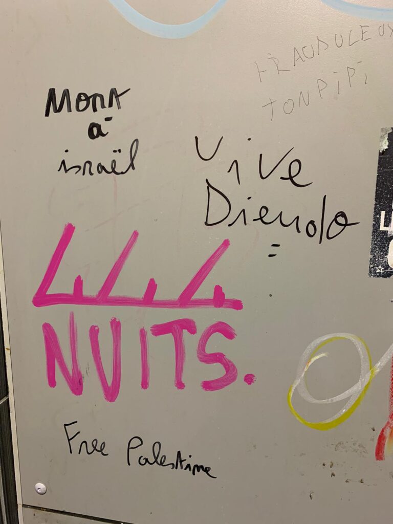 Lors d’une conférence organisée par les bloqueurs dans cet amphithéâtre le vendredi 3 février, nous entendons un membre de ces organisations crier pendant la conférence « Mort à Israël, vive la Palestine ».Des propos n’ayant pas choqué l’auditoire car personne ne releva mais tout le monde acquiesça.