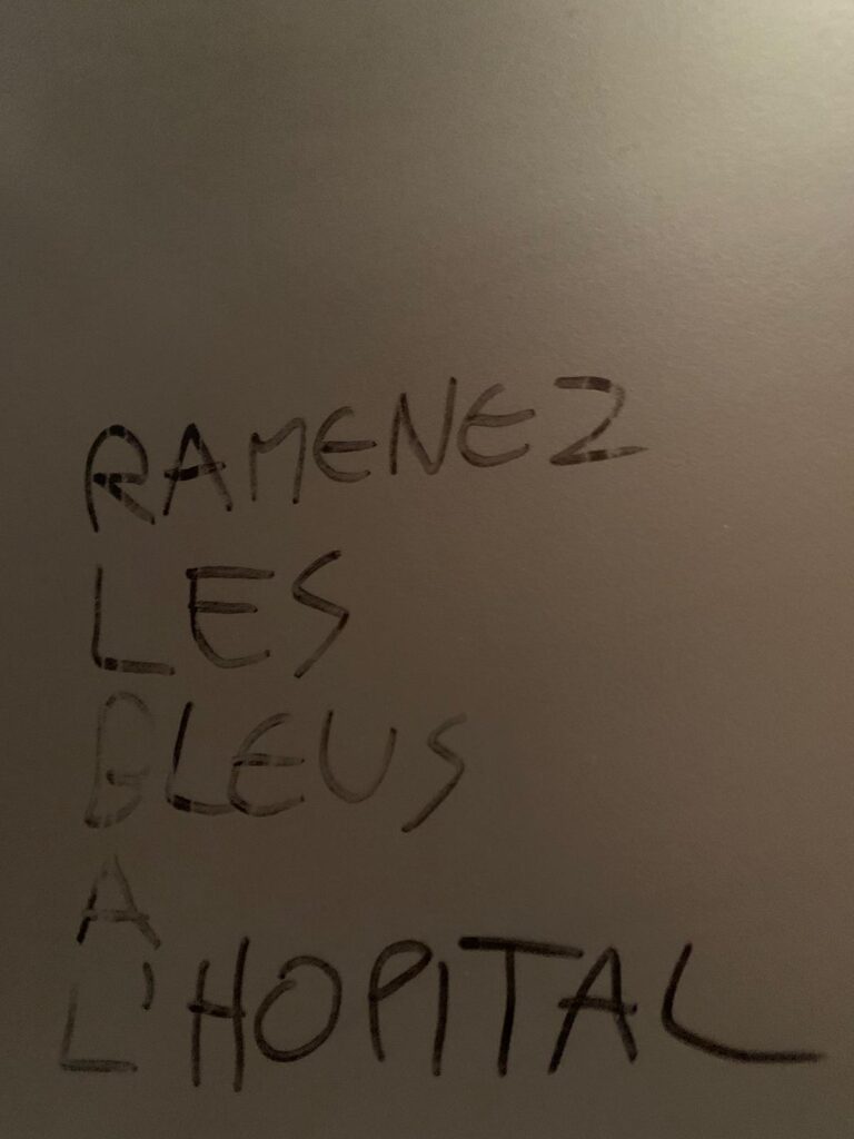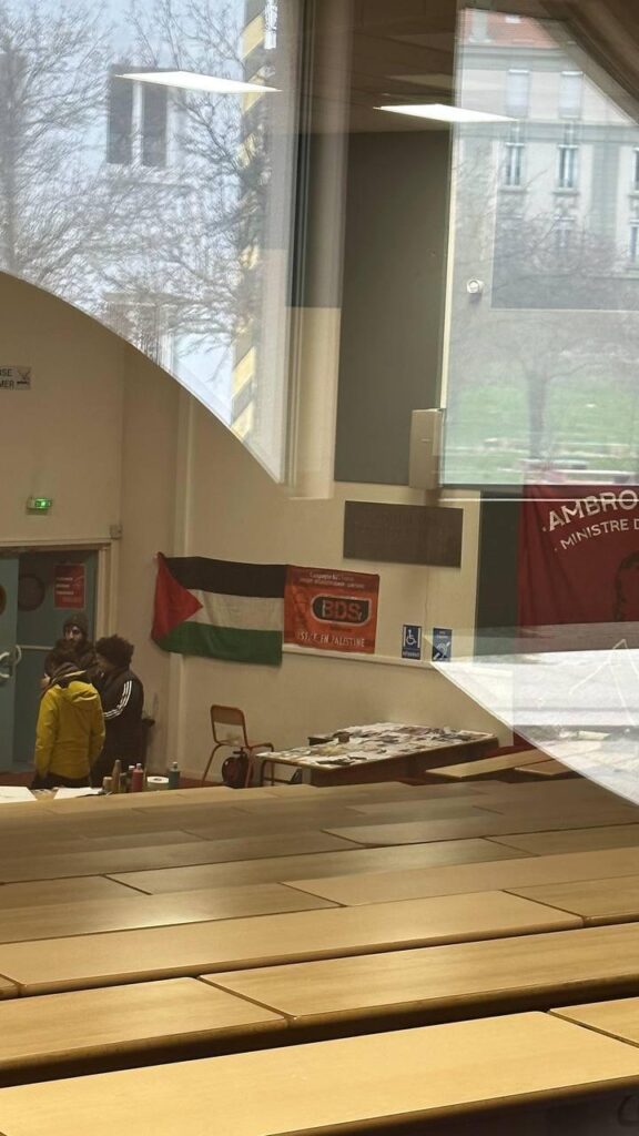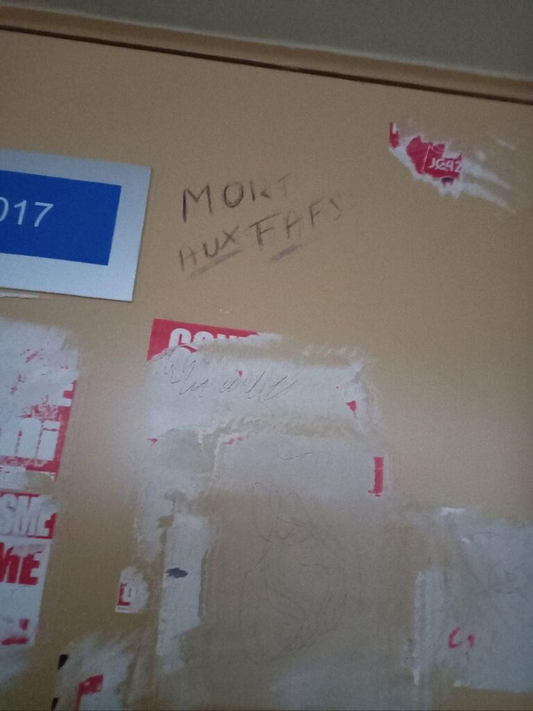 Nous avons constaté la présence du drapeau palestinien mais aussi celui du collectif antisémite « Boycott, désinvestissement et sanctions (BDS) » dans la salle ainsi que de nombreux tags antisémites et appelant à la mort d’Israël qui ont recouvert la fac sans réaction de la part de l’Université. Récemment, notre local situé Campus Tréfilerie a également été vandalisé. Ainsi, des stickers, et des tags comportant des injures et menaces de mort (« mort aux FAF ») pouvaient être lisibles sur notre porte d’entrée et le couloir nous menant à lui.