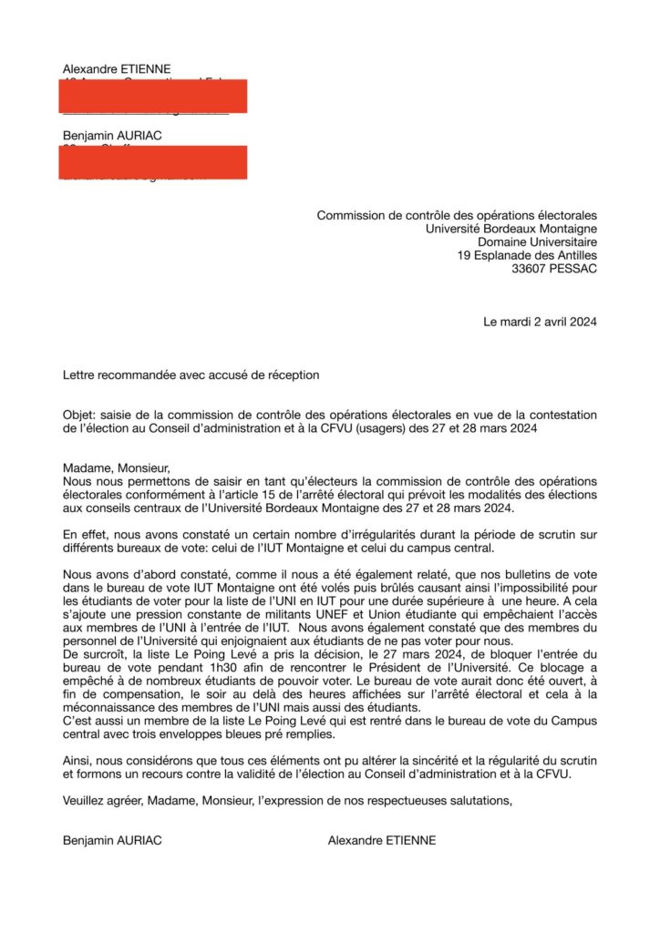 Lors des élections de l’Université Bordeaux Montaigne les 27 et 28 mars dernier, nos militants ont fait face à de nombreuses fraudes électorales de la part des différentes listes d’extrême gauche, qui par peur de voir l’UNI progresser comme elle le fait depuis des années à Bordeaux, a préféré brûler nos bulletins de vote, bloquer le bureau de vote et intimider les étudiants.