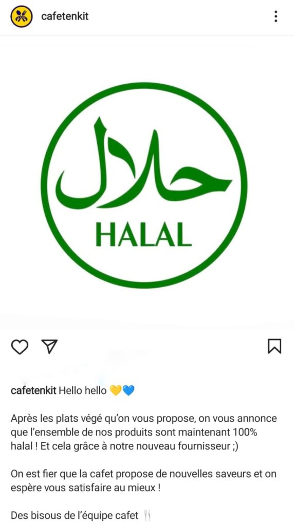 Le 19 octobre 2021, l’UNI Grenoble a dévoilé que l’unique cafétéria de Science Po Grenoble n’offrira plus que des “produits 100% Halal”, selon une publication sur le réseau social Instagram du compte “Cafetenkit”. Cette cafétéria dispose non seulement d’une autorisation d’occupation des locaux par la direction de l’Institut d’études politiques de Grenoble, sans quoi elle ne pourrait disposer des lieux pour vendre ses produits, mais aussi d’une situation de monopole de fait, puisqu’aucune alternative n’est présente au sein de l’IEP. Selon certains étudiants de l’IEP favorables à cette décision, cela permettrait une plus grande “inclusivité” et surtout les étudiants non-musulmans pourraient tout de même se nourrir avec ces produits Halal. En somme, cela faciliterait la vie à tout le monde.